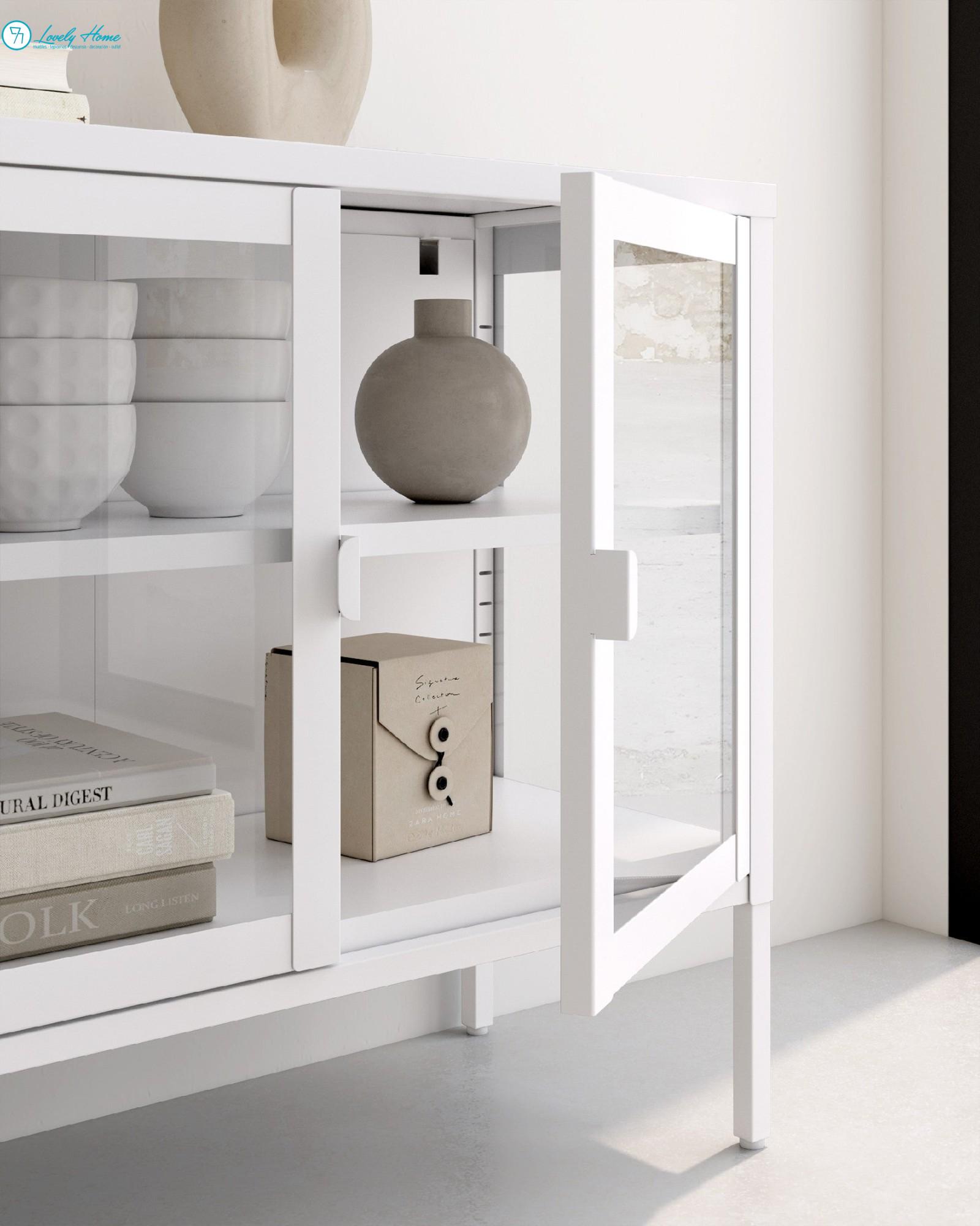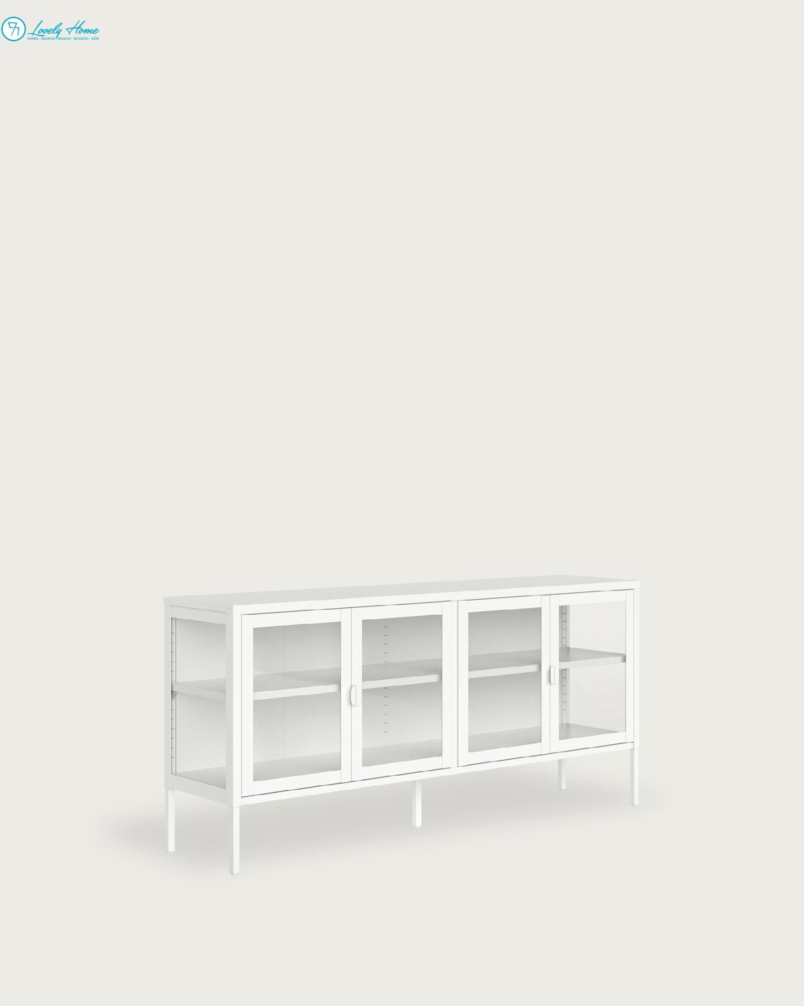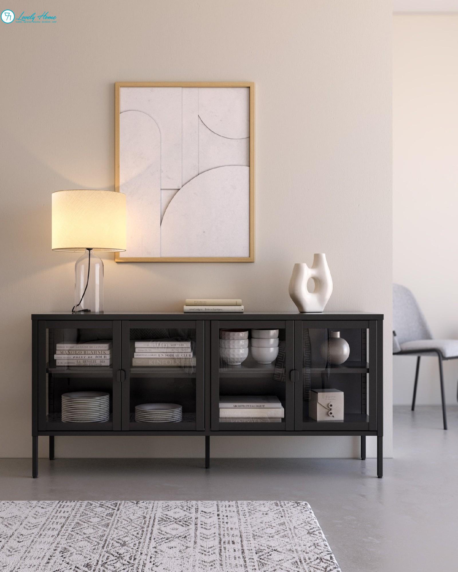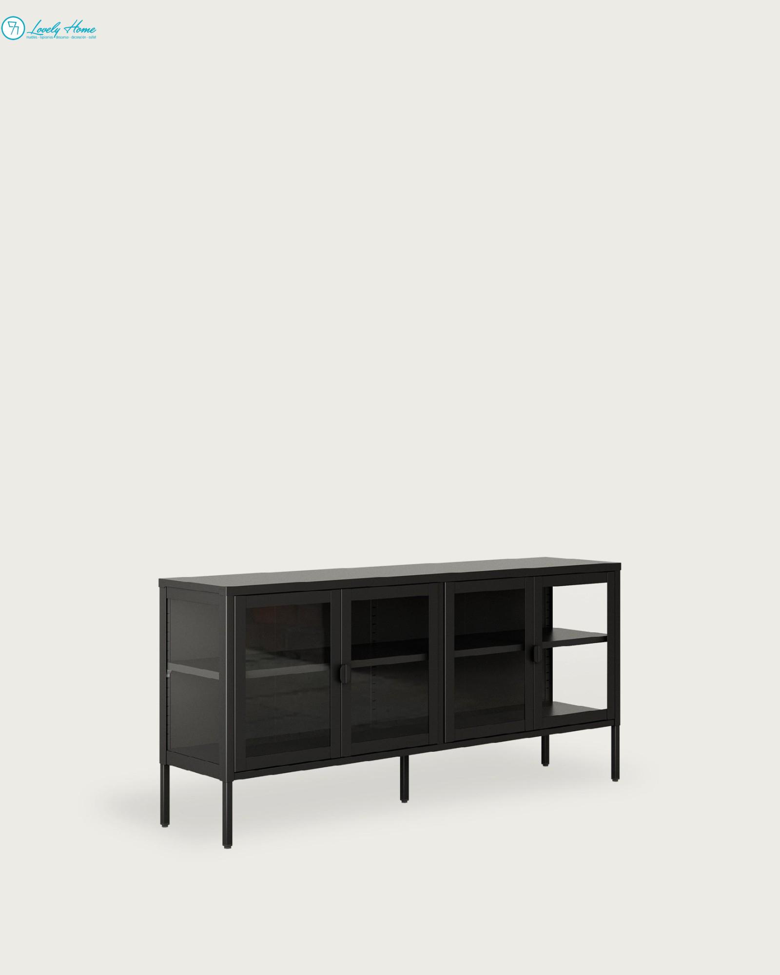 Su diseño destaca por sus 4 puertas de cristal, que convierten este aparador en una auténtica vitrina horizontal. Es perfecto para exhibir tu vajilla favorita, libros de diseño o piezas decorativas, manteniéndolos protegidos del polvo pero a la vista. La combinación de colores Negro y Crema aporta un contraste sutil y elegante que encaja tanto en decoraciones industriales como modernas o clásicas renovadas.