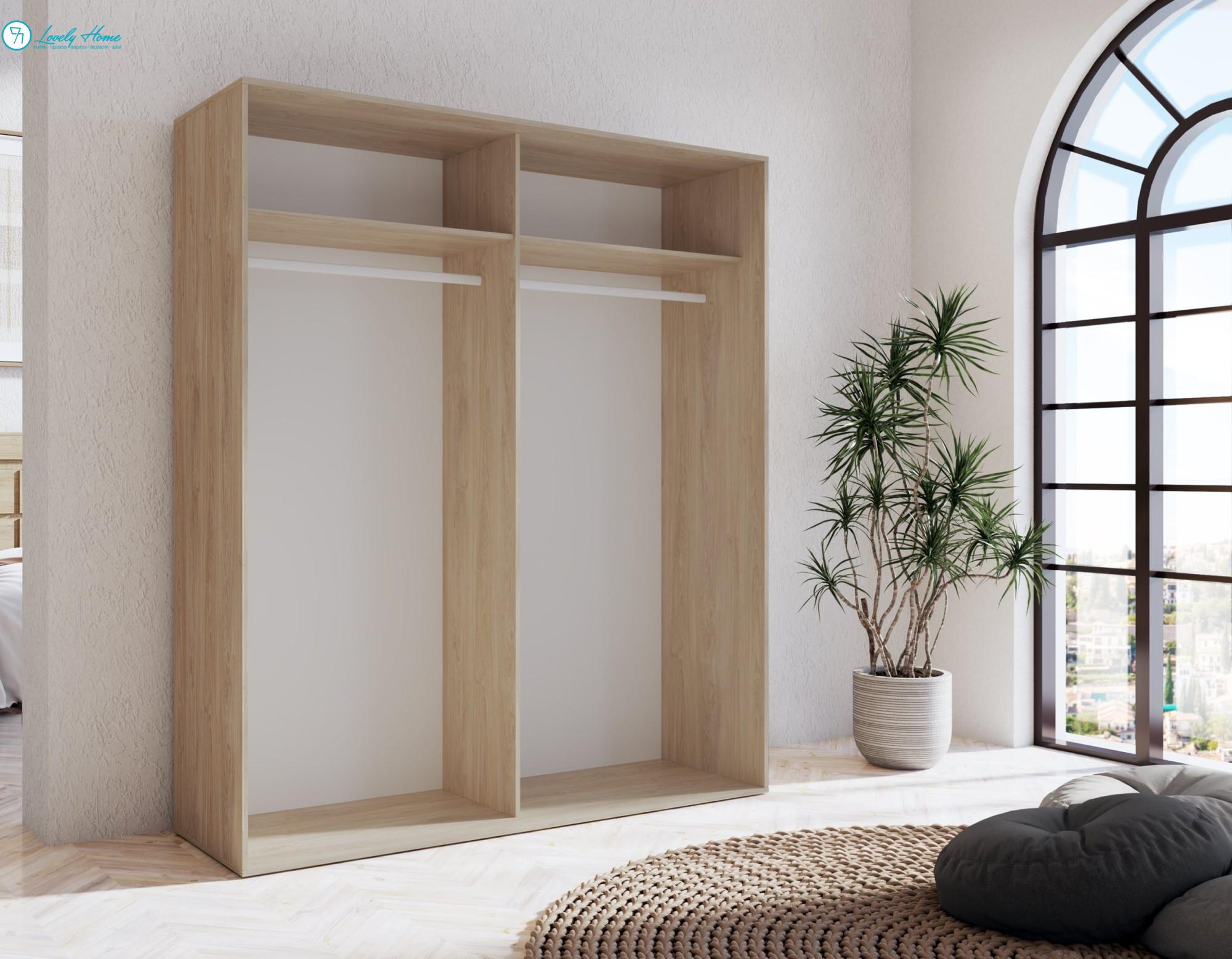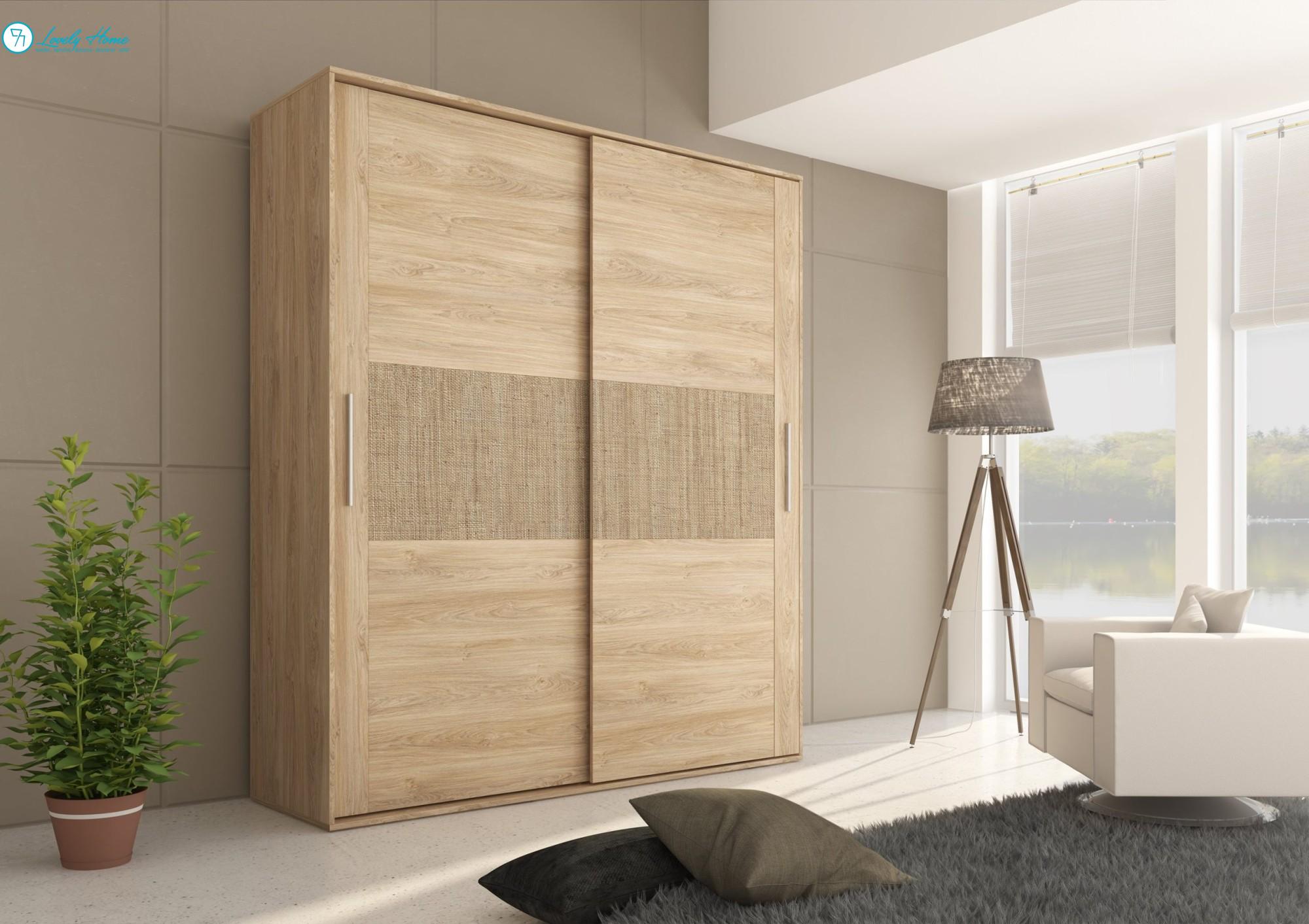 El armario ropero con dos puertas correderas de 181 cm de ancho, está fabricado con materiales de primera calidad como son los tableros de partículas de madera de densidad media de 16 mm recubiertos por chapa sintética de color cambrian. El armario se compone de dos costados laterales, un costado central en el interior que divide el armario en dos partes, un sombrero y un zócalo que es donde van enganchadas las correderas del armario mediante un mecanismo de guías metálicas que facilitan la apertura con mucha suavidad.