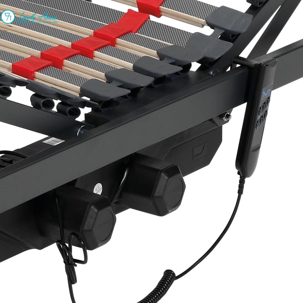 – Motor doble de 4500 Newton, de última generación (independiente cabecero-piecero, o los 2 a la vez), silencioso, con pila de emergencia para el retorno a cero (posición de reposo), en caso de corte de energía eléctrica. Motorización accionable por mando con cable.