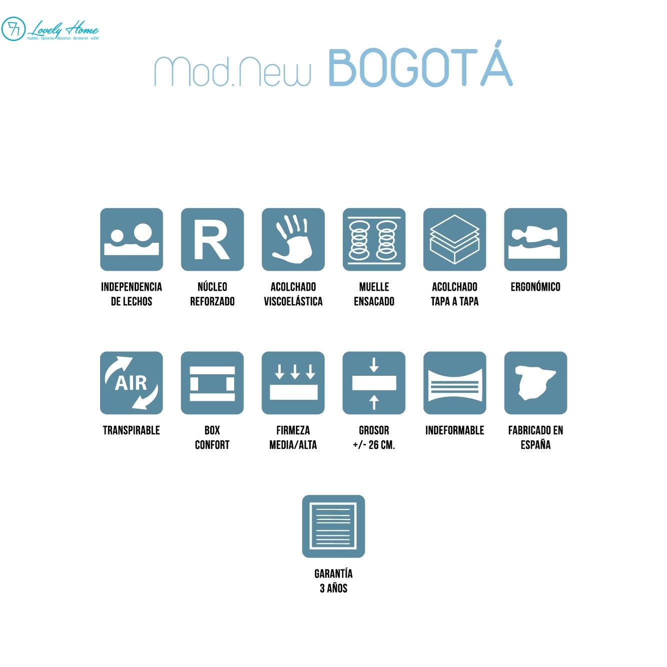 Lo que hace destacar al New Bogotá frente a otros modelos es su estructura interna ultra-reforzada. Cuenta con el Sistema BOX, un refuerzo perimetral en todo el contorno que evita deformaciones al sentarse en los bordes. Además, incorpora un refuerzo extra de fieltro ondulado de 1800 gr en ambas caras sobre el muelle.