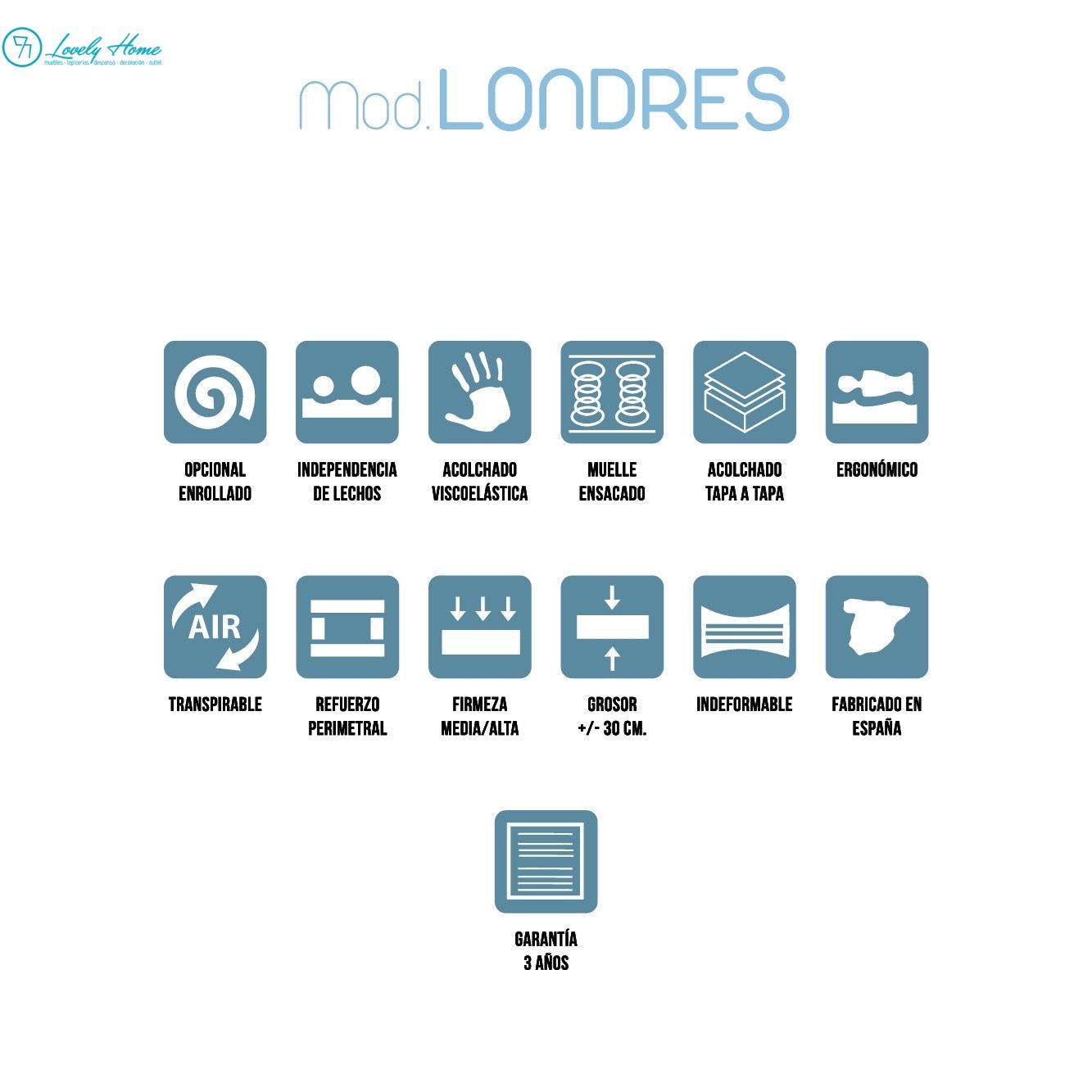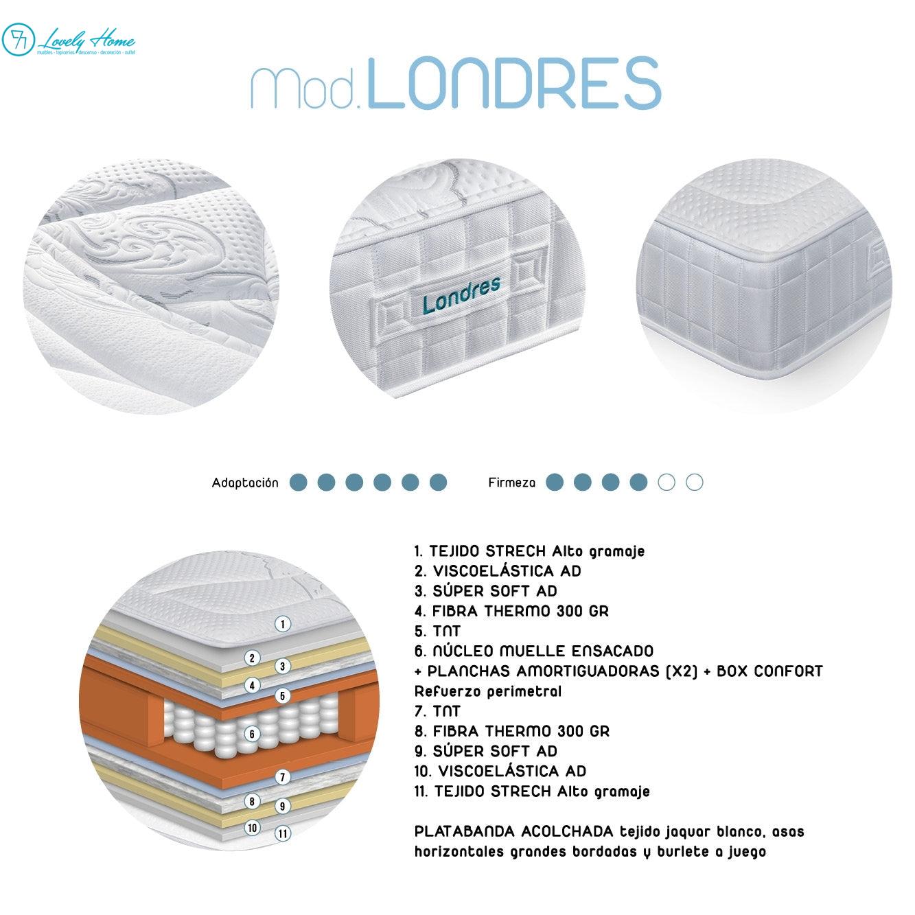 ¿Buscas la sensación de dormir en un hotel de cinco estrellas cada noche? En Muebles Lovely Home te presentamos el Colchón Londres, una pieza de alta gama que combina la precisión de los muelles ensacados con un acolchado suntuoso en ambas caras. Con un grosor imponente de 30 cm, este colchón no solo destaca por su presencia, sino por ofrecer una independencia de lechos total y un soporte excepcional para las cervicales. Si buscas colchones de calidad en Sevilla con el máximo confort, el modelo Londres es tu mejor elección.