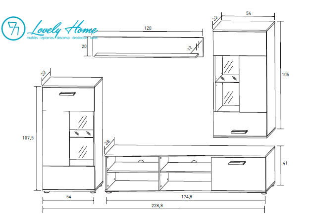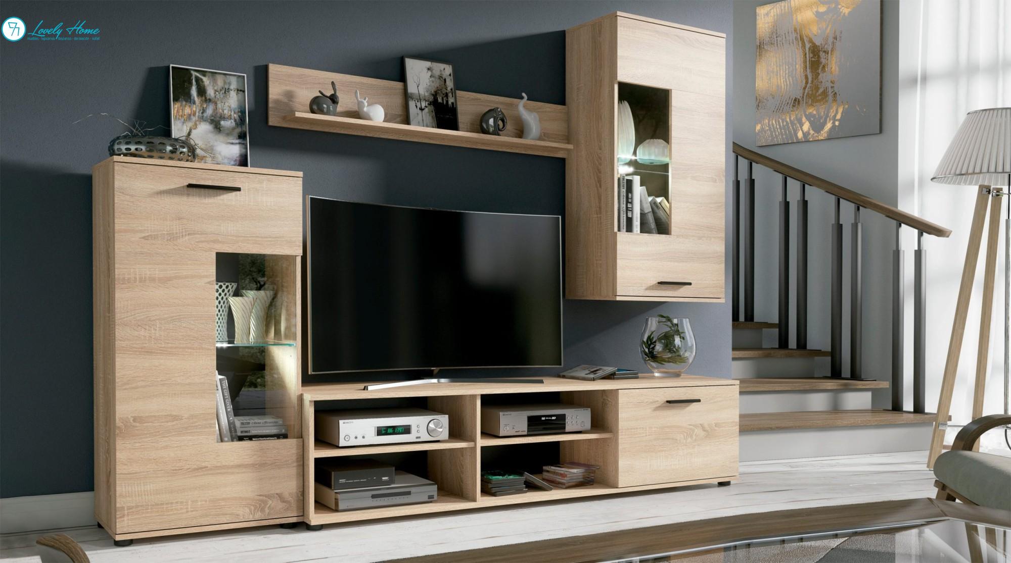 Compuesta por varias piezas, incluye un módulo bajo para TV con 2 huecos abiertos y un compartimento cerrado con puerta abatible, un módulo bajo vertical tipo vitrina, un módulo alto colgado y un estante de pared. Su diseño elegante y de formas rectas combina los colores Artico y Roble Cambrian.