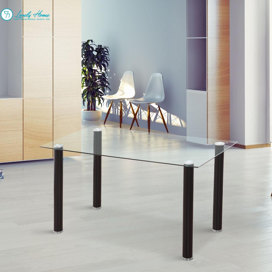 • Material: Sobre de cristal transparente (fácil limpieza y resistencia) y patas metálicas negras.