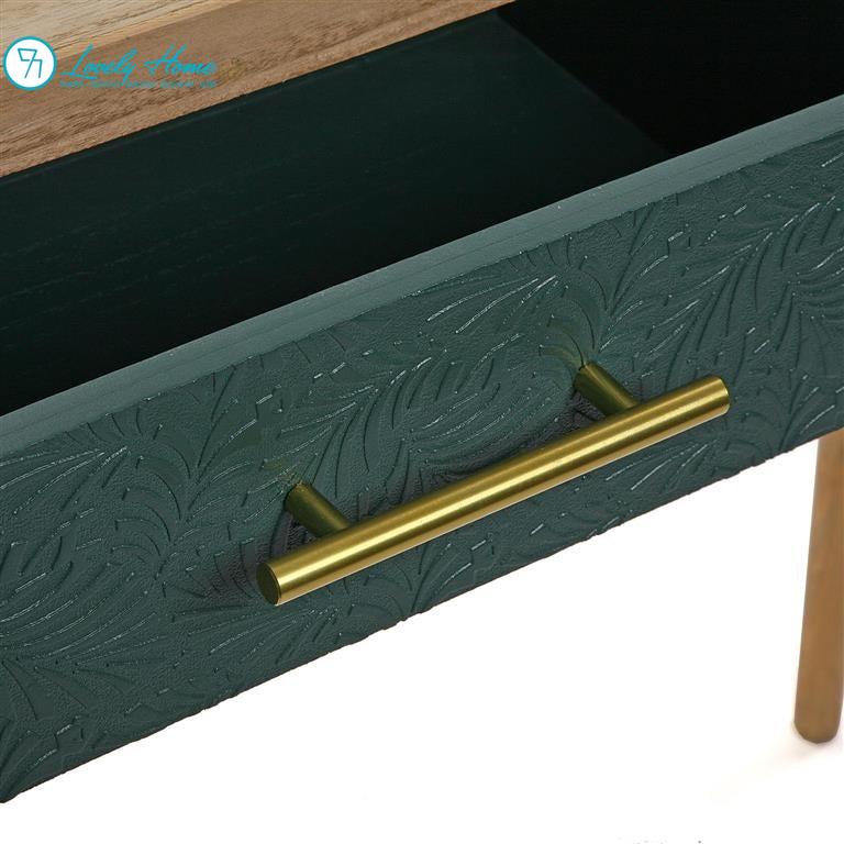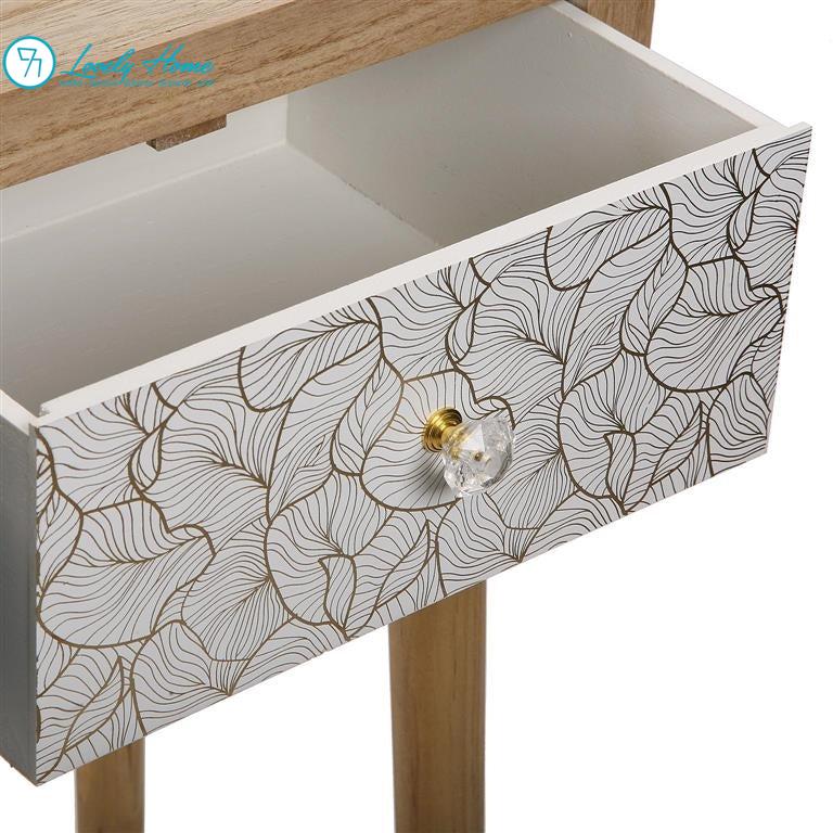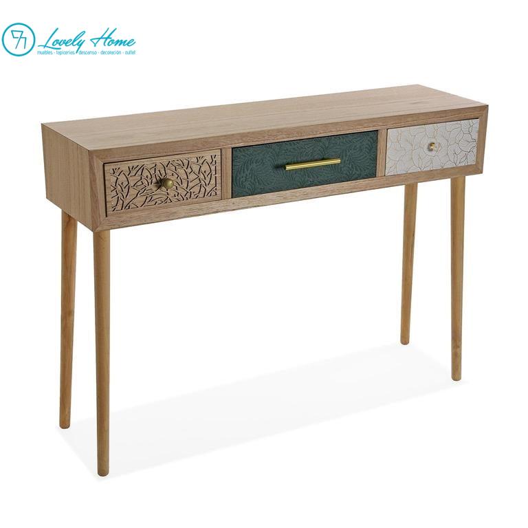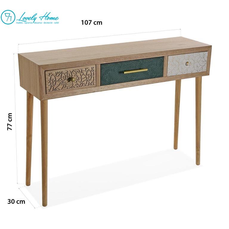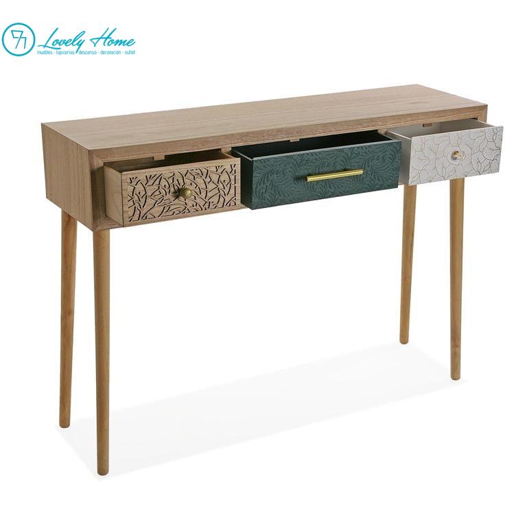 Consola de diseño para entrada, está compuesta de materiales como MDF, tiradores metálicos y patas de madera.