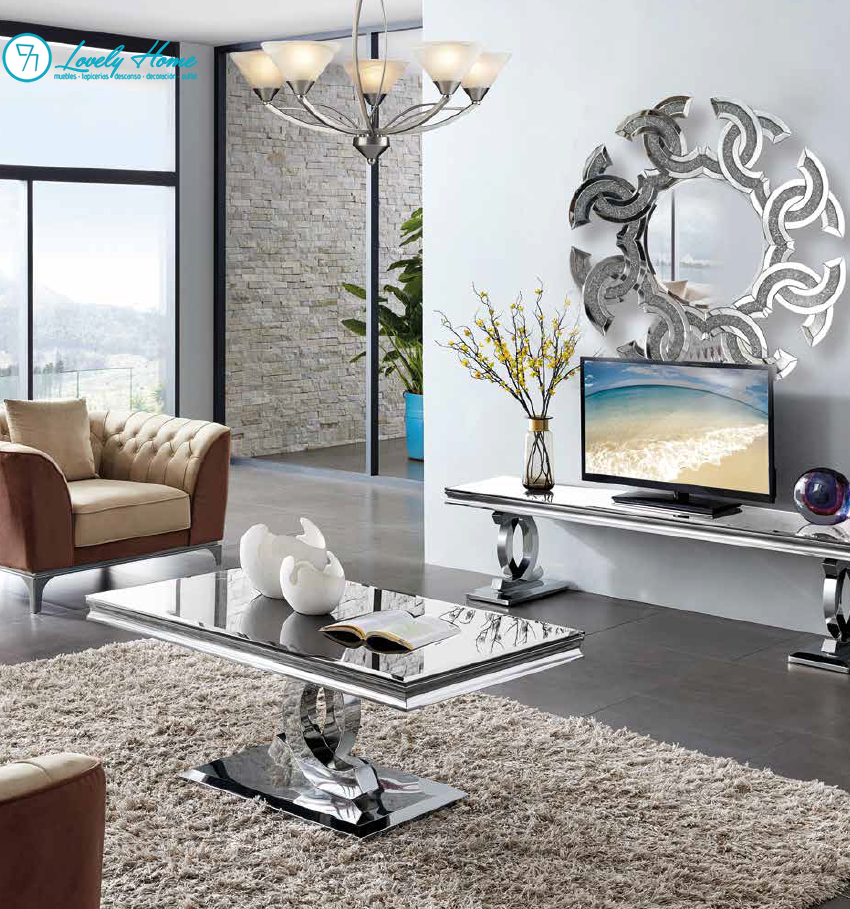 La Mesa Noemi destaca por su espectacular base de formas curvas y esculturales, fabricada en materiales metálicos de alta calidad con un acabado en acero brillante. Este acabado no solo aporta un look «glam» y moderno, sino que ayuda a reflejar la luz, haciendo que tu salón parezca más amplio y luminoso.